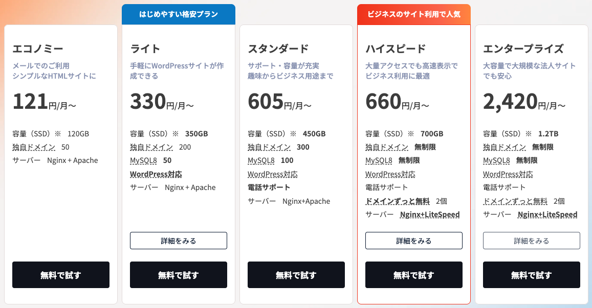 ドメインは何でもOK!PV数も見込んでいない…であれば、ライトプランがオススメです!